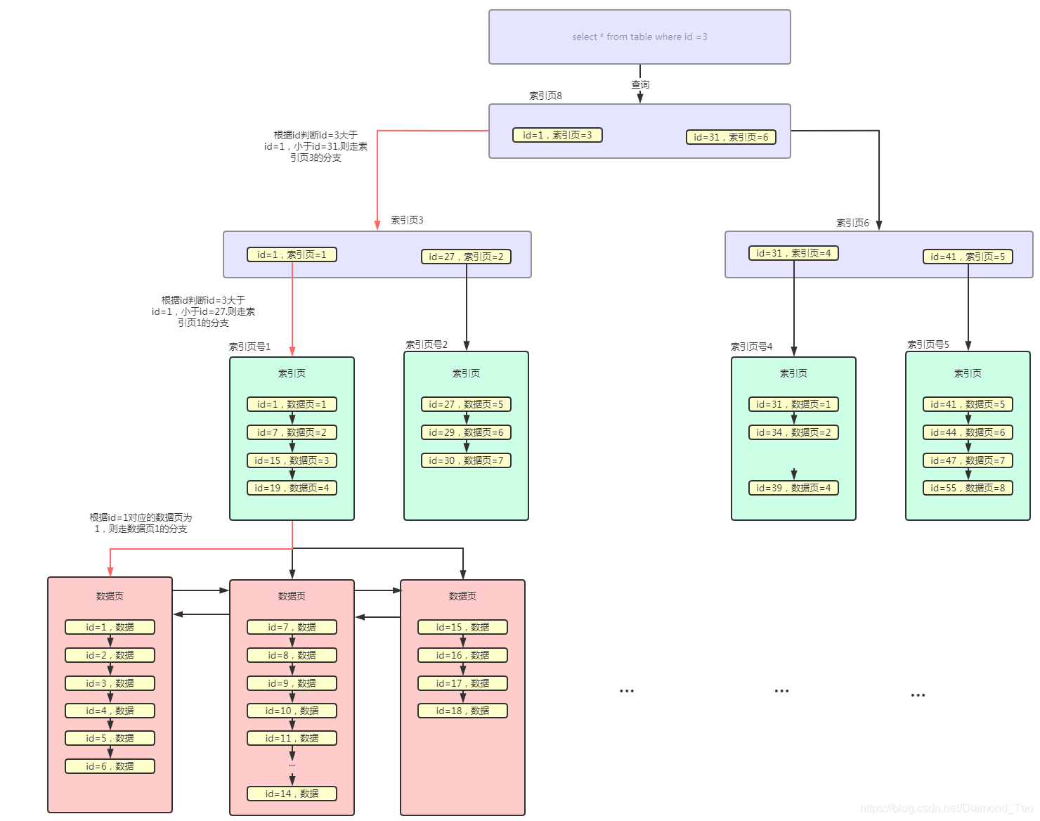 我們再來看下,數(shù)據(jù)查詢在B+樹中的查詢過程。舉個栗子,如當前需要查詢id為3的數(shù)據(jù),那么將在索引頁中判斷應(yīng)該走索引頁為3的索引頁。那么在索引頁為3中繼續(xù)判斷id=1應(yīng)該走索引頁為1的索引頁,在索引頁中判斷應(yīng)該頁號為1的數(shù)據(jù)頁,在此數(shù)據(jù)頁中遍歷最終查詢到對應(yīng)的數(shù)據(jù)。