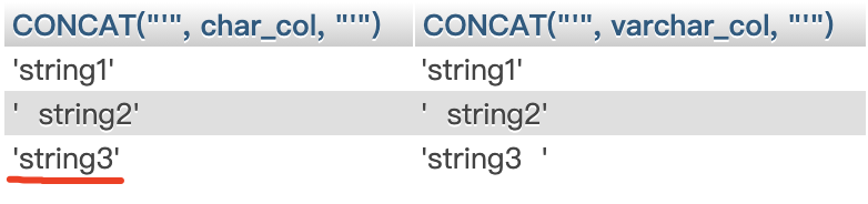得出來的結果如下,可以看到 CHAR 類型的 string3后面的空格被移除了,而 VARCHAR類型的沒有。這種情況大多數(shù)時候不會有什么問題,實際在應用中也經(jīng)常會使用 trim 函數(shù)移除兩端的空字符,但是如果確實需要存儲空格的時候,那就需要注意不要選擇使用 CHAR 類型: