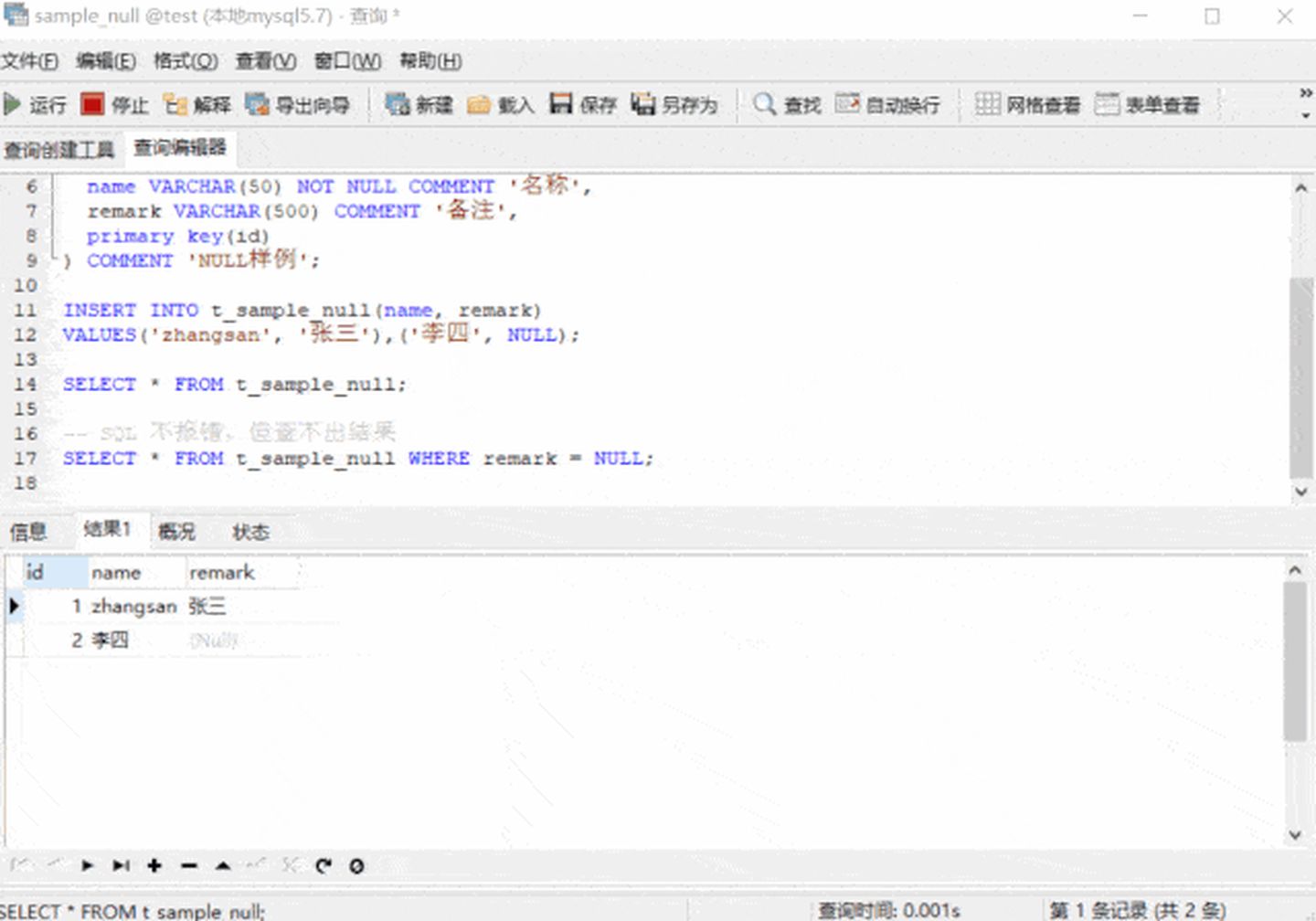 -- SQL 不報錯,但查不出結(jié)果 SELECT * FROM t_sample_null WHERE remark = NULL;