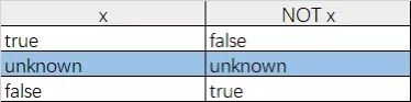 這個三值邏輯不是三目運算,指的是三個邏輯值,有人可能有疑問了,邏輯值不是只有真(true)和假(false)嗎,哪來的第三個?說這話時我們需要注意所處的環(huán)境,在主流的編程語言中(C、JAVA、Python、JS等)中,邏輯值確實只有 2 個,但在 SQL 中卻存在第三個邏輯值:unknown。這有點類似于我們平時所說的:對、錯、不知道。