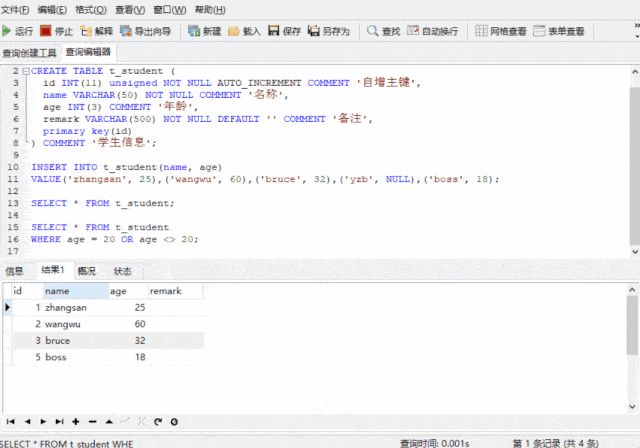 VALUE('zhangsan', 25),('wangwu', 60),('bruce', 32),('yzb', NULL),('boss', 18);