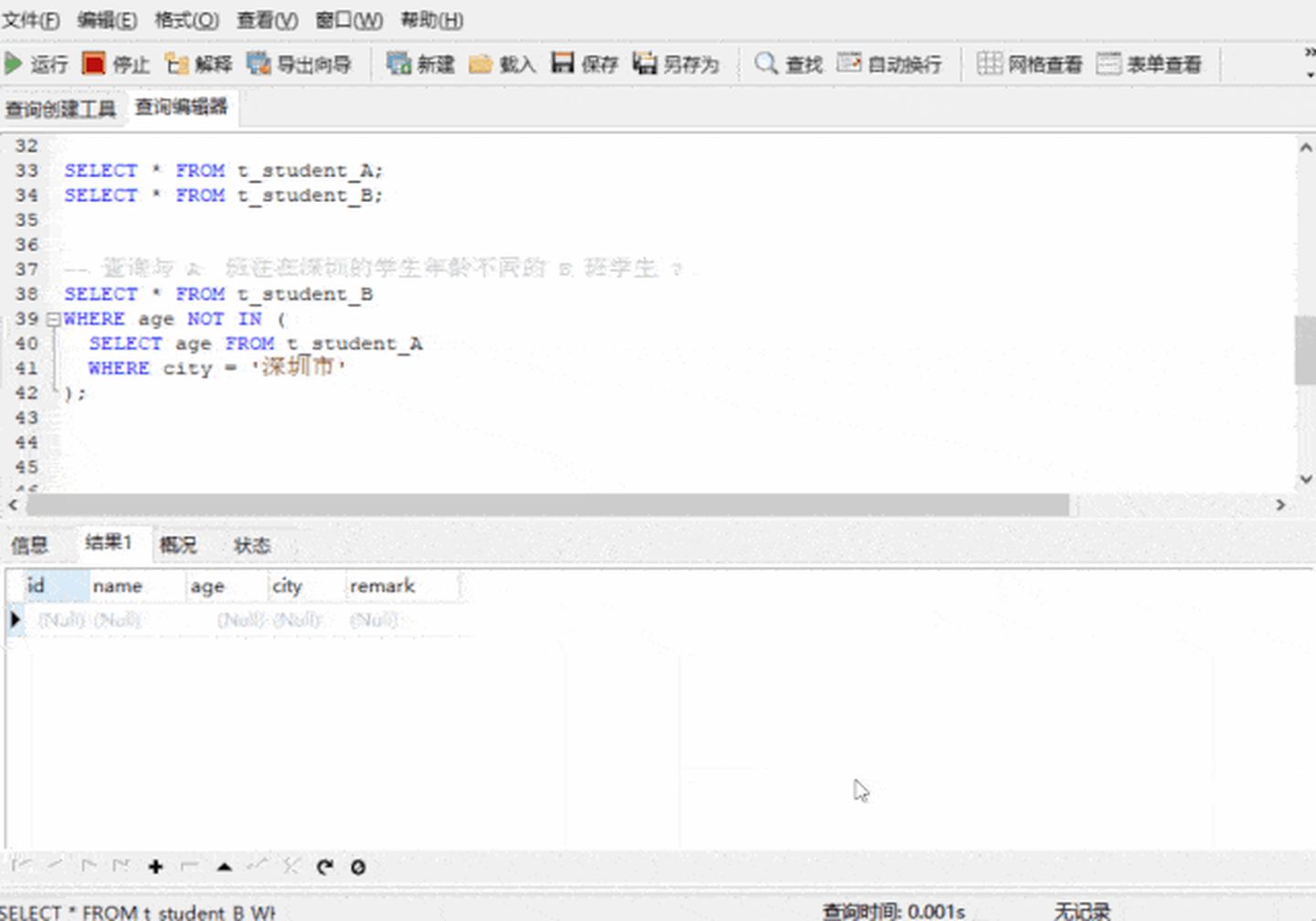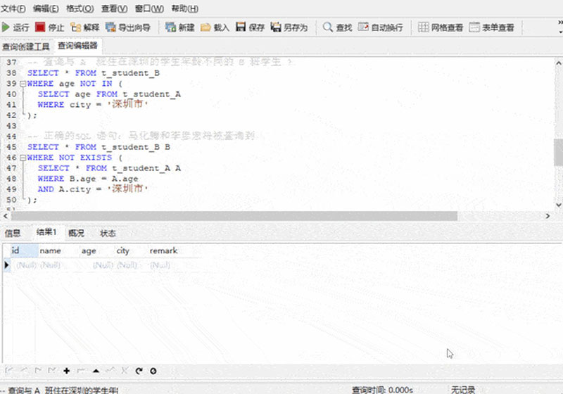 -- 查詢與 A 班住在深圳的學(xué)生年齡不同的 B 班學(xué)生 ?