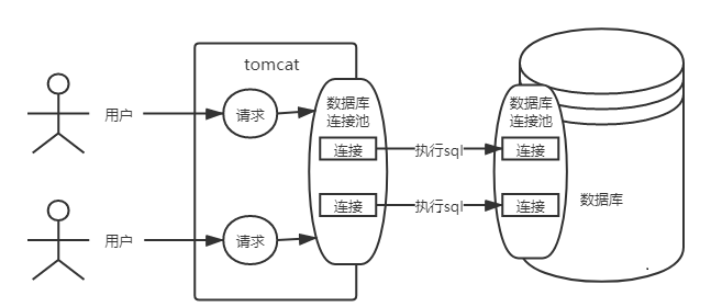 一般我們知道,web項目開發(fā)完以后,可以將項目文件打成一個war包,然后通過Tomcat容器進行發(fā)布,最后用戶就可以訪問我們的系統(tǒng)了。我們都知道,Tomcat是支持并發(fā)訪問的,當多個請求需要同時操作數(shù)據(jù)庫的時候,難道是多個請求去搶占一個數(shù)據(jù)庫連接嗎?那肯定不是的,不然效率得多低下,那難道是給每個請求都建立一個連接,請求結束后再銷毀連接嗎?那肯定也不是的,頻繁建立、銷毀連接肯定也是影響性能的。那Tomcat是如何解決這個問題的呢? 還記得我們在講線程池的時候提到的“池化”思想嗎?是的,Tomcat中有一個數(shù)據(jù)庫連接池,那么同樣的數(shù)據(jù)庫服務器中也有一個對應的數(shù)據(jù)庫連接池,大致結構如下圖所示