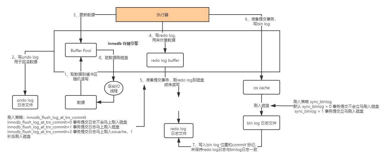 前面我們已經(jīng)介紹了,更新操作是在Buffer Pool中完成的,也就是在內(nèi)存中完成的,萬一操作完以后MySQL宕機了,那么必然會使內(nèi)存中修改過的數(shù)據(jù)丟失。為了解決這個問題InnoDB架構中設計了redo log,用來記錄你對什么數(shù)據(jù)進行了修改。如果出現(xiàn)MySQL宕機,重啟之后可以通過redo log來進行數(shù)據(jù)恢復。但是redo log也是先將redo log寫到內(nèi)存中的redo log buffer中,并沒有持久化到磁盤,所以數(shù)據(jù)丟失的風險依然存在。所以InnoDB提供了幾種redo log刷盤策略,通過innodb_flush_log_at_trx_commit來進行設置刷盤策略,比如innodb_flush_log_at_trx_commit=1表示事務提交日志馬上刷入磁盤,這樣就不會存在數(shù)據(jù)丟失的風險,但是性能肯定會受到影響。一般可以根據(jù)業(yè)務需求進行設置策略。