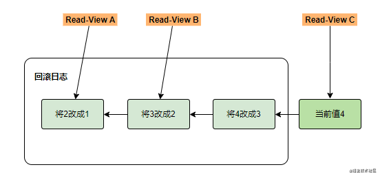 當(dāng)前值是 4,但是在查詢這條記錄的時(shí)候,不同時(shí)刻啟動(dòng)的事務(wù)會(huì)有不同的 read-view。如圖中看到的,在視圖 A、B、C 里面,這一個(gè)記錄的值分別是 1、2、4,同一條記錄在系統(tǒng)中可以存在多個(gè)版本,就是數(shù)據(jù)庫(kù)的多版本并發(fā)控制(MVCC)。對(duì)于 read-view A,要得到 1,就必須將當(dāng)前值依次執(zhí)行圖中所有的回滾操作得到。