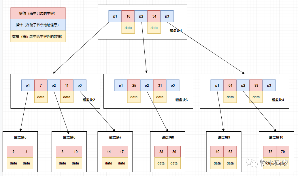 每個(gè)節(jié)點(diǎn)占用一個(gè)磁盤(pán)塊,一個(gè)節(jié)點(diǎn)上有兩個(gè)升序排序的關(guān)鍵字和三個(gè)指向子樹(shù)根節(jié)點(diǎn)的指針,指針存儲(chǔ)的是子節(jié)點(diǎn)所在磁盤(pán)塊的地址。兩個(gè)關(guān)鍵詞劃分成的三個(gè)范圍域?qū)?yīng)三個(gè)指針指向的子樹(shù)的數(shù)據(jù)的范圍域。以根節(jié)點(diǎn)為例,關(guān)鍵字為16和34,P1指針指向的子樹(shù)的數(shù)據(jù)范圍為小于16,P2指針指向的子樹(shù)的數(shù)據(jù)范圍為16~34 ,P3指針指向的子樹(shù)的數(shù)據(jù)范圍為大于34。