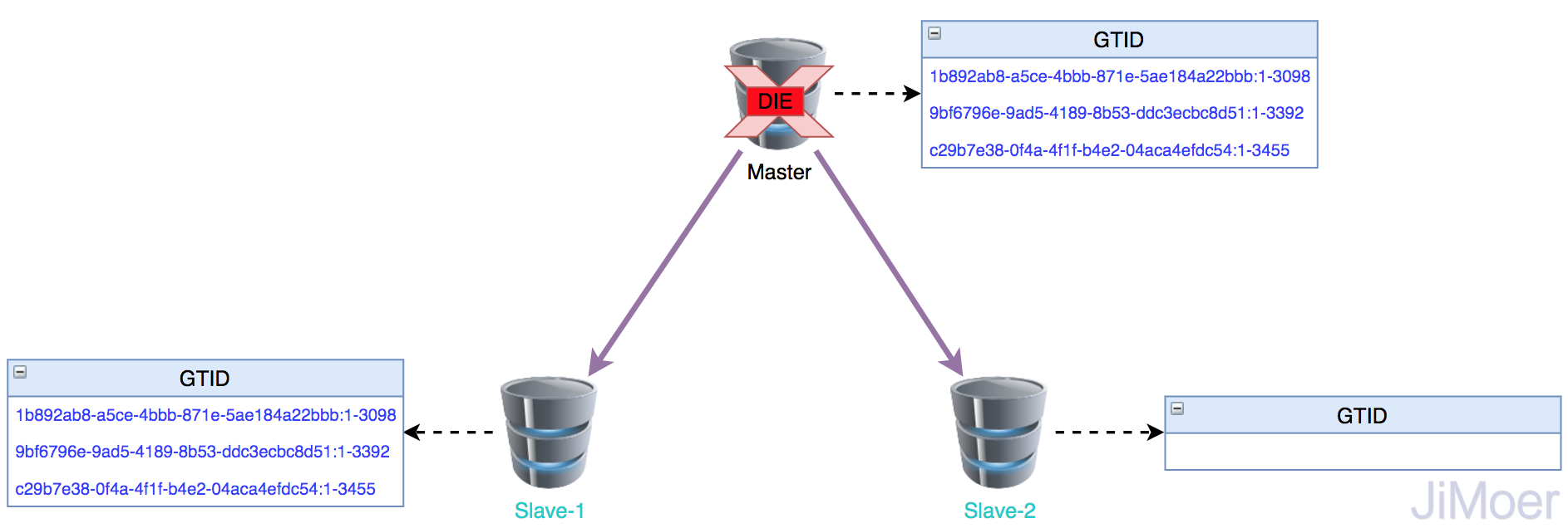 通過(guò)上圖我們可以看出來(lái),當(dāng)Master掛掉后,Slave-1執(zhí)行完了Master的事務(wù),Slave-2延時(shí)一些,所以沒(méi)有執(zhí)行完Master的事務(wù),這個(gè)時(shí)候提升Slave-1為主,Slave-2連接了新主(Slave-1)后,將最新的GTID傳給新主,然后Slave-1就從這個(gè)GTID的下一個(gè)GTID開始發(fā)送事務(wù)給Slave-2。這種自我尋找復(fù)制位置的模式減少事務(wù)丟失的可能性以及故障恢復(fù)的時(shí)間。