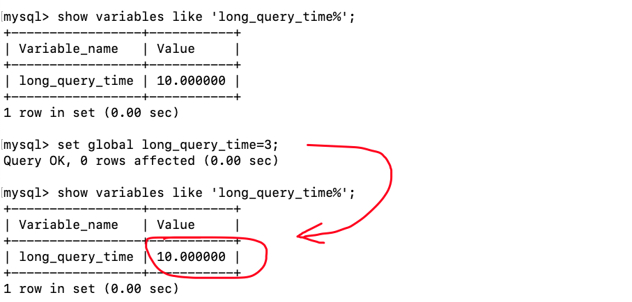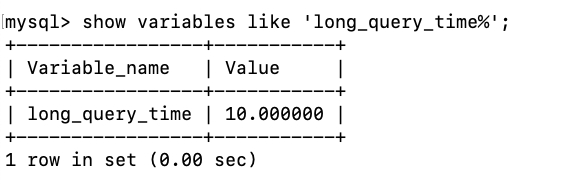通過 show variables like ‘long_query_time%' 來查看默認(rèn)時間長度,單位是秒: