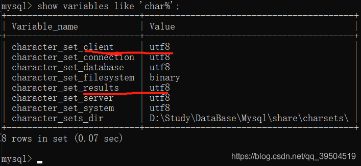 原因:cmd命令行默認使用gbk編碼,而set character_set_results卻為utf8。
