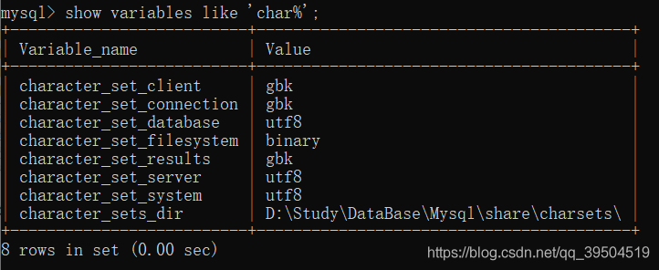 原因:cmd命令行默認使用gbk編碼,而character_set_client卻為utf8。