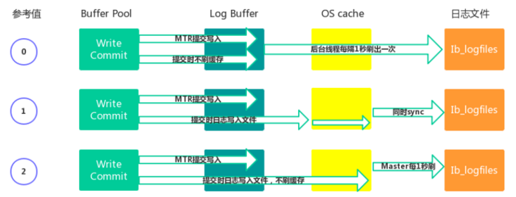 0:每秒提交 Redo buffer ->OS cache -> flush cache to disk,可能丟失一秒內(nèi)的事務(wù)數(shù)據(jù)。由后臺Master線程每隔 1秒執(zhí)行一次操作。