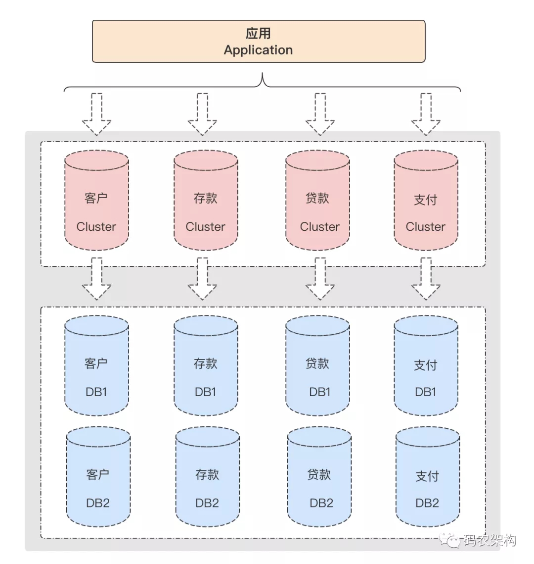 分類進(jìn)行獨(dú)立劃分。與"微服務(wù)治理"的做法相似,每個(gè)微服務(wù)使用單獨(dú)的一個(gè)數(shù)據(jù)庫。如圖: