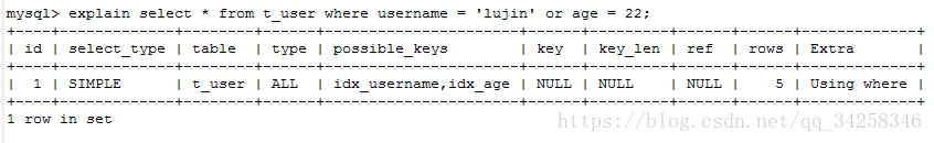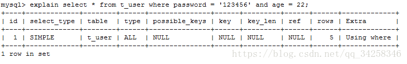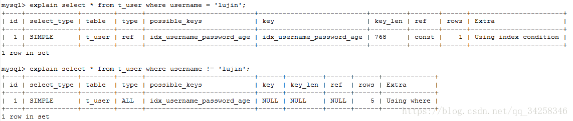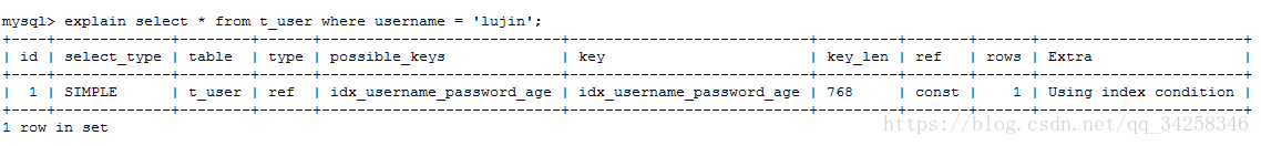 分析:該查詢只有一個username條件,根據(jù)最佳左前綴原則索引能夠被使用到,但是是部分使用