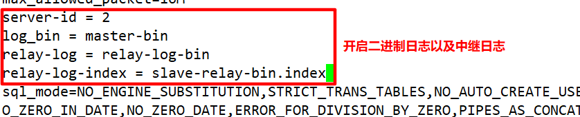 vim /etc/my.cnf server-id = 2 #三臺(tái)服務(wù)器的 server-id 不能一樣 log_bin = master-bin relay-log = relay-log-bin relay-log-index = slave-relay-bin.index systemctl restart mysqld