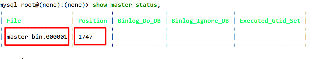 (2)在 Master 節(jié)點(diǎn)查看二進(jìn)制文件和同步點(diǎn)