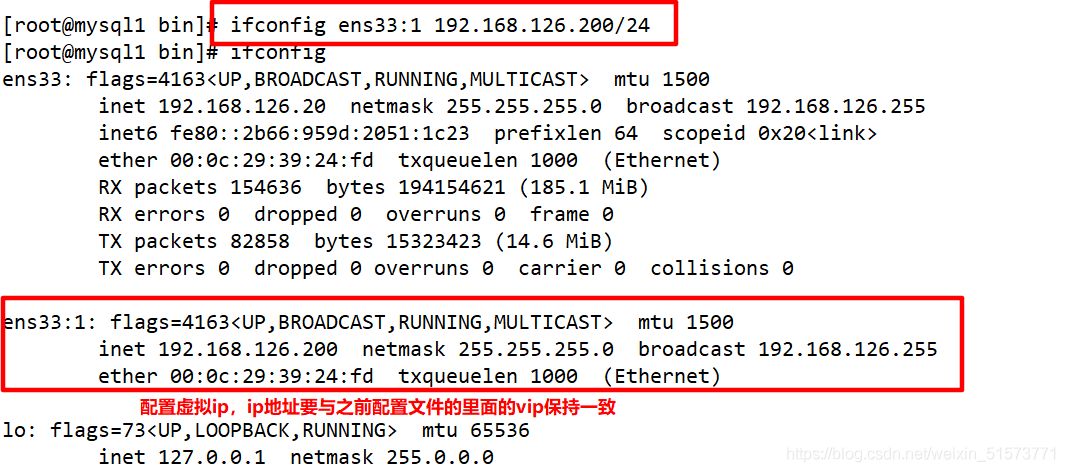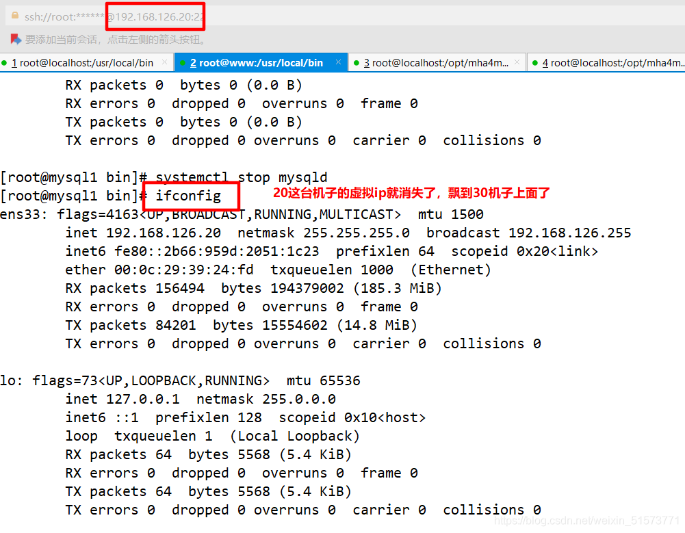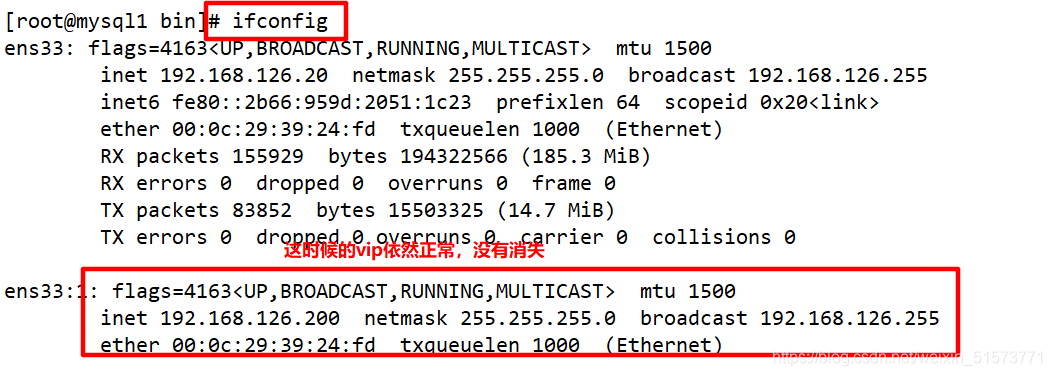 查看 Mysql1 的 VIP 地址 192.168.126.200 是否存在,這個(gè) VIP 地址不會(huì)因?yàn)?manager 節(jié)點(diǎn)停止 MHA 服務(wù)而消失。