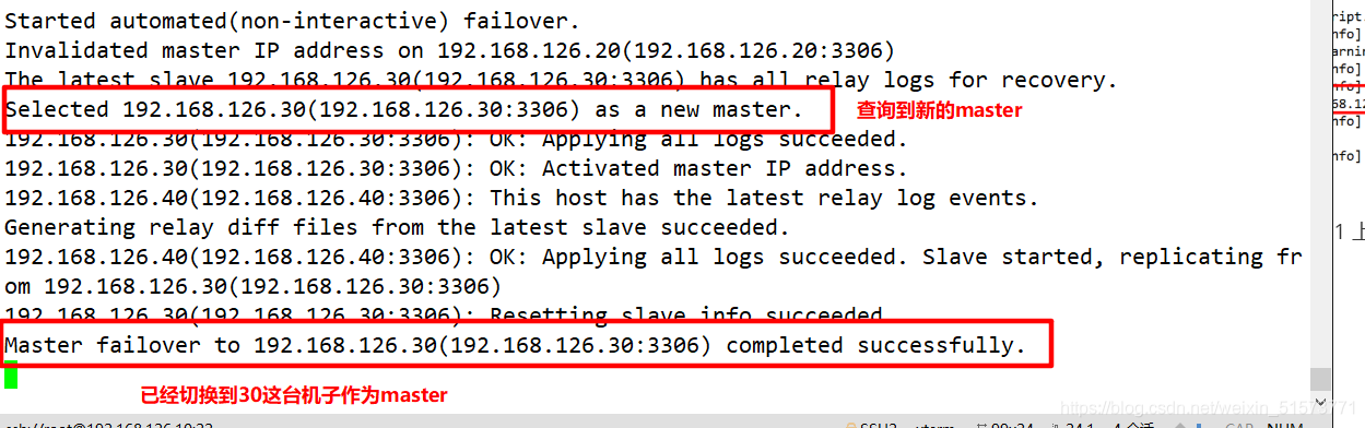 14. 查看 MHA 日志,也以看到當(dāng)前的 master 是 192.168.126.20,如下所示。