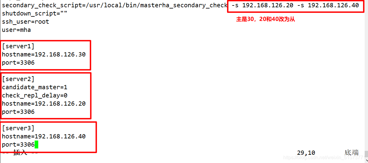 vim /etc/masterha/app1.cnf ...... secondary_check_script=/usr/local/bin/masterha_secondary_check -s 192.168.126.20 -s 192.168.126.40 ...... [server1] hostname=192.168.126.30 port=3306 [server2] candidate_master=1 check_repl_delay=0 hostname=192.168.126.20 port=3306 [server3] hostname=192.168.126.40 port=3306