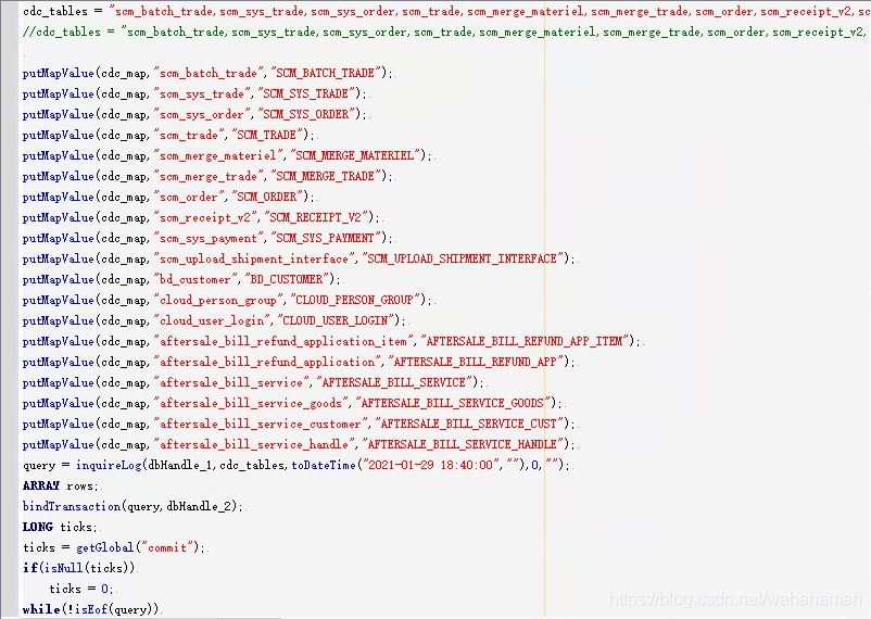 當(dāng)所有全量同步作業(yè)運(yùn)行結(jié)束后,編輯實(shí)時(shí)任務(wù)腳本,在變量cdc_tables中指定已經(jīng)全量同步完成的表;在inquireLog函數(shù)參數(shù)中設(shè)置日志捕獲起始點(diǎn),可將最先運(yùn)行的全量同步作業(yè)的啟動(dòng)時(shí)間指定為日志捕獲起始點(diǎn),日志捕獲點(diǎn)只需在任務(wù)初次執(zhí)行時(shí)設(shè)置一次,以后任務(wù)運(yùn)行將自動(dòng)管理日志捕獲點(diǎn)。