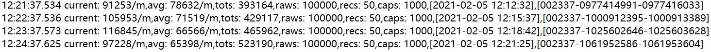 實(shí)時(shí)任務(wù)運(yùn)行后,在日志窗口輸出MySQL數(shù)據(jù)庫日志解析信息,包含每分鐘讀取的日志記錄,最近解析日志時(shí)間點(diǎn)。