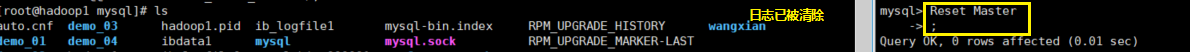 通過 Reset Master 指令刪除全部 binlog 日志,刪除之后,日志編號,將從 xxxx.000001重新開始 。
