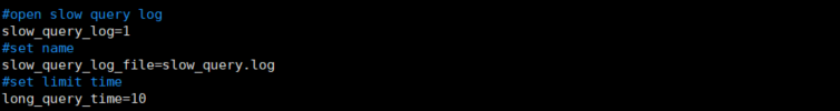 # 該參數(shù)用來控制慢查詢?nèi)罩臼欠耖_啟, 可取值: 1 和 0 , 1 代表開啟, 0 代表關(guān)閉 slow_query_log=1 # 該參數(shù)用來指定慢查詢?nèi)罩镜奈募? slow_query_log_file=slow_query.log # 該選項(xiàng)用來配置查詢的時間限制, 超過這個時間將認(rèn)為值慢查詢, 將需要進(jìn)行日志記錄, 默認(rèn)10s long_query_time=10