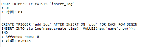 DROP TRIGGER IF EXISTS `insert_log`; delimiter ;; CREATE TRIGGER `add_log` AFTER INSERT ON `stu` FOR EACH ROW BEGIN INSERT INTO stu_log(name,create_time) VALUES(new.`name`,now()); END ;; delimiter ;
