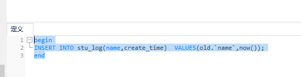 begin INSERT INTO stu_log(name,create_time) VALUES(old.`name`,now()); end