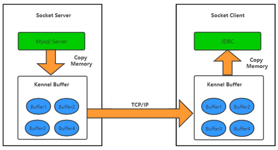 JDBC與數(shù)據(jù)庫之間的通信是通過socket完,大致流程如下圖所示。Mysql Server ->內(nèi)核Socket Buffer -> 客戶端Socket Buffer ->JDBC所在的JVM