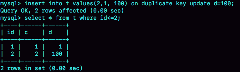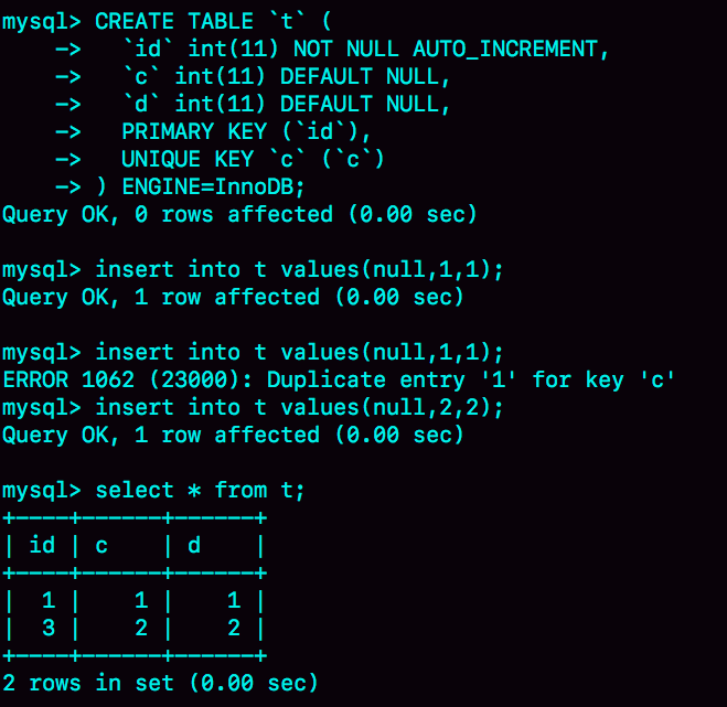 CREATE TABLE `t` ( `id` int(11) NOT NULL AUTO_INCREMENT, `c` int(11) DEFAULT NULL, `d` int(11) DEFAULT NULL, PRIMARY KEY (`id`), UNIQUE KEY `c` (`c`) ) ENGINE=InnoDB; insert into t values(null, 1,1); insert into t values(null, 2,2); insert into t values(null, 3,3); insert into t values(null, 4,4); create table t2 like t