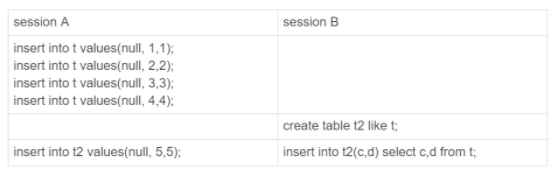 insert into t values(null, 1,1); insert into t values(null, 2,2); insert into t values(null, 3,3); insert into t values(null, 4,4); create table t2 like t; insert into t2(c,d) select c,d from t; insert into t2 values(null, 5,5);