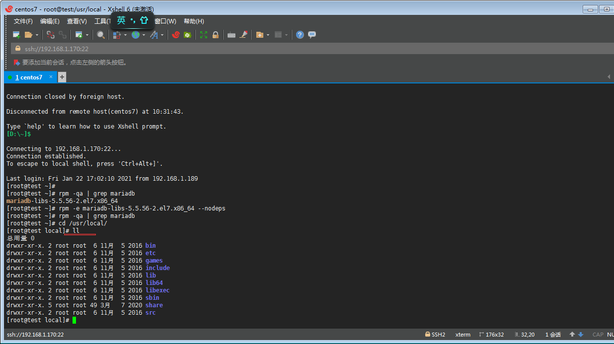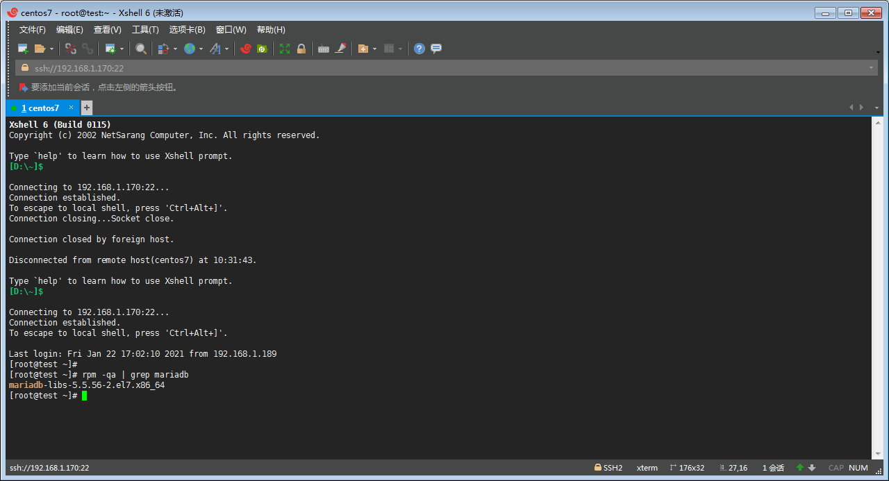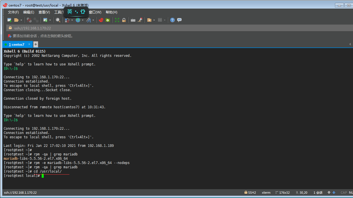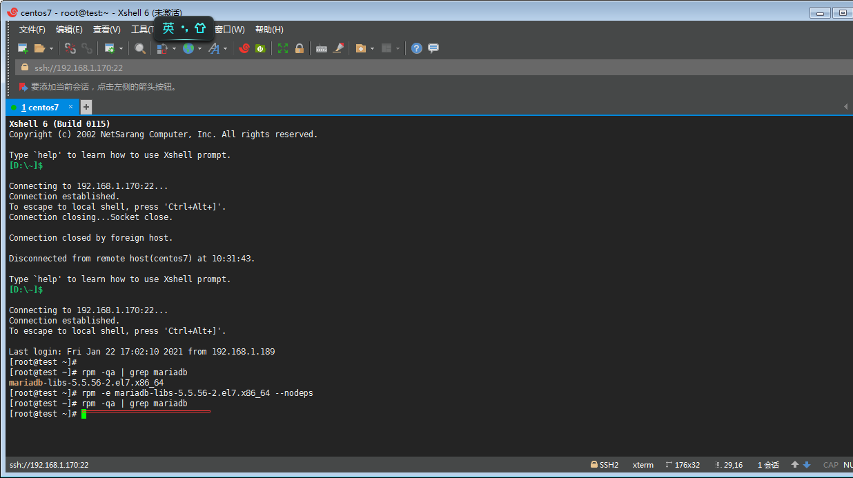 ②丶再通過命令 rpm -e mariadb-libs-5.5.56-2.el7.x86_64 --nodeps 卸載mariadb