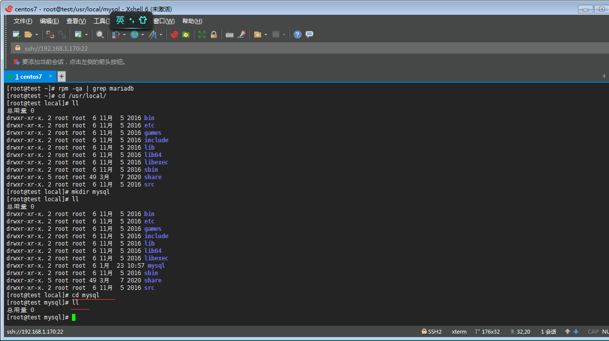 ⑥丶通過mkdir mysql 命令 在當(dāng)前目錄下創(chuàng)建一個名為 mysql 的目錄,并且ll查看一下新建的mysql目錄