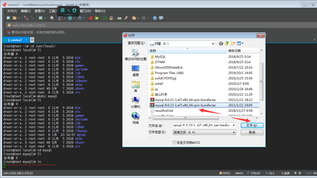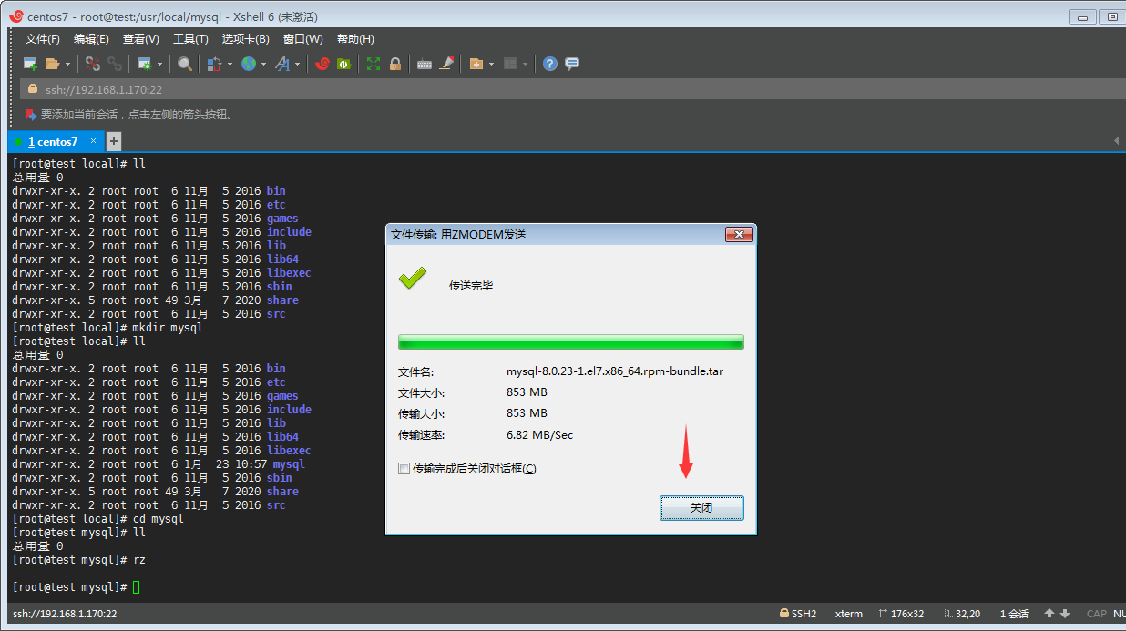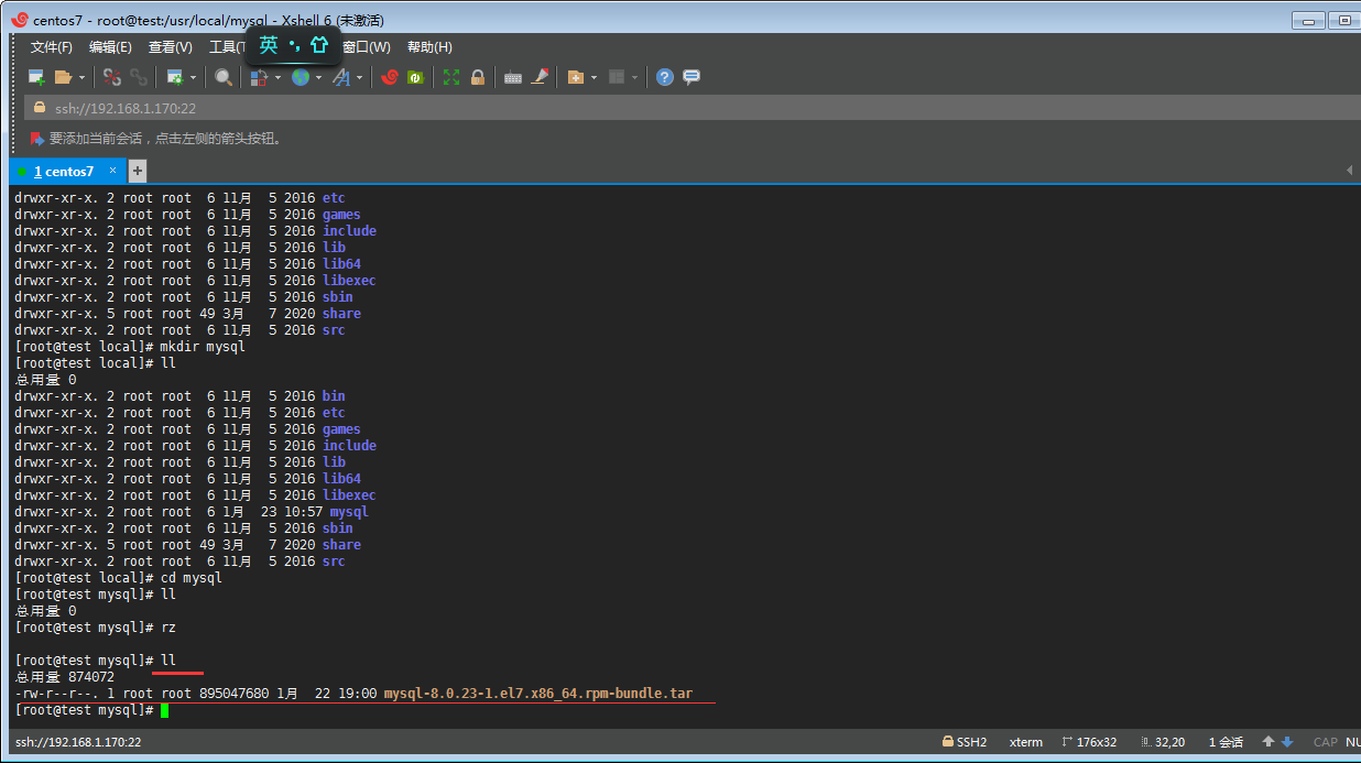 ⑧丶然后通過 rz 命令上傳之前下載的mysql數(shù)據(jù)包