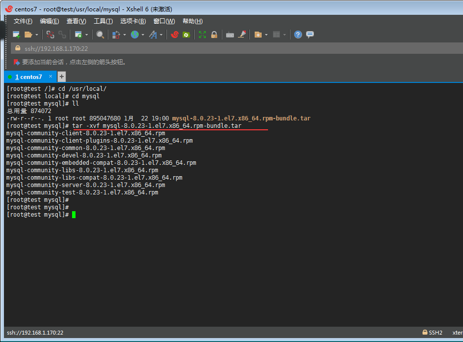 B丶通過 tar -xvf mysql-8.0.11-1.el7.x86_64.rpm-bundle.tar 命令解壓tar 包