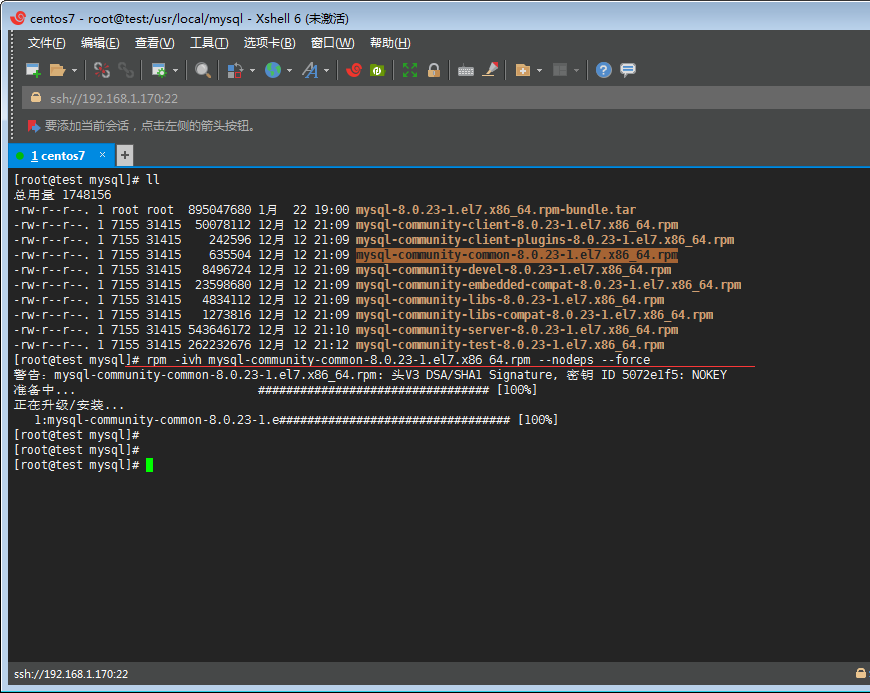 D丶通過rpm -ivh mysql-community-common-8.0.11-1.el7.x86_64.rpm --nodeps --force 命令安裝common