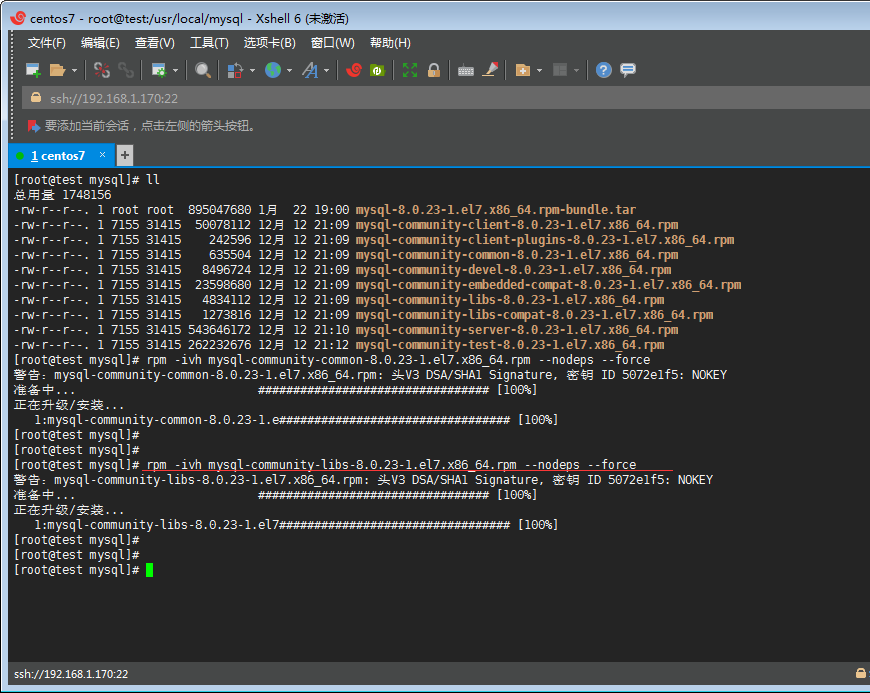 E 丶通過rpm -ivh mysql-community-libs-8.0.11-1.el7.x86_64.rpm --nodeps --force命令安裝libs