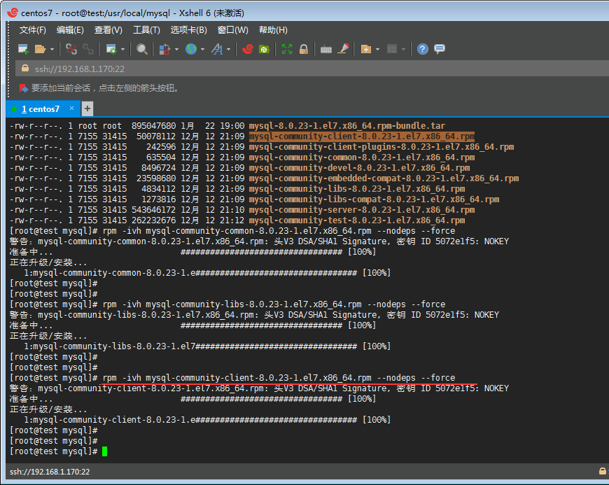 F丶.通過rpm -ivh mysql-community-client-8.0.11-1.el7.x86_64.rpm --nodeps --force命令安裝client