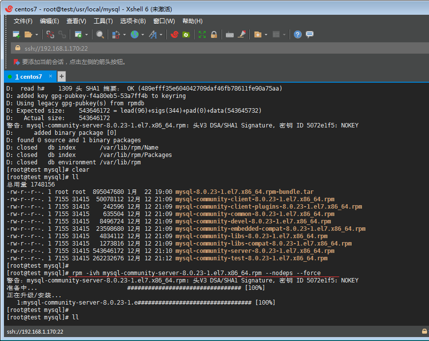 G丶通過rpm -ivh mysql-community-server-8.0.11-1.el7.x86_64.rpm --nodeps --force命令安裝server