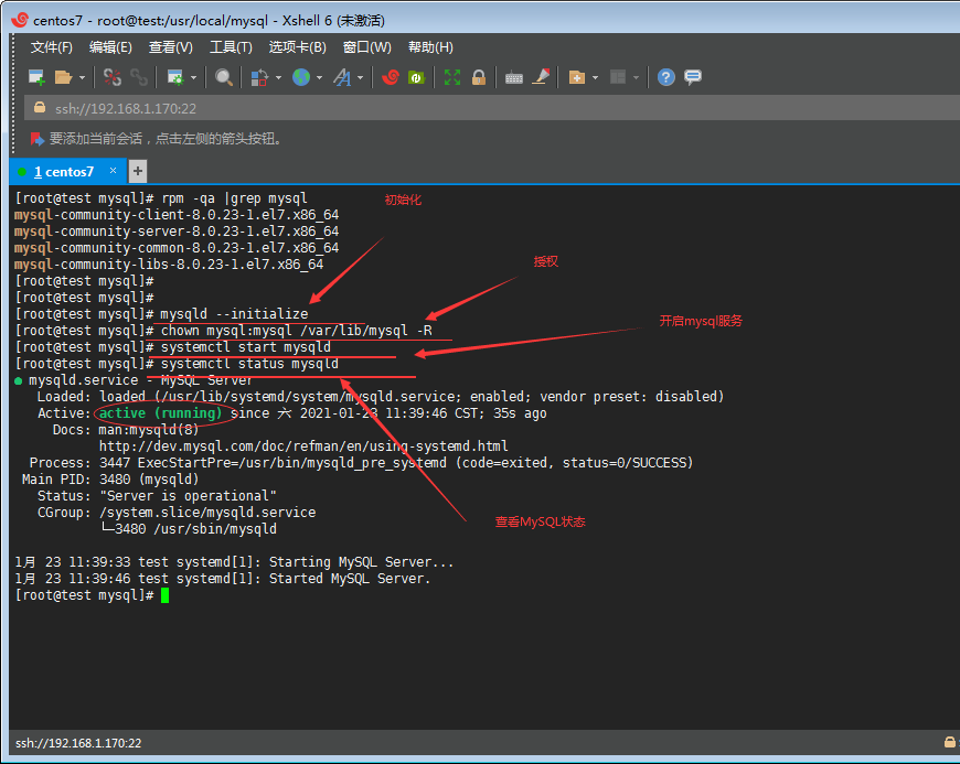 mysqld --initialize 初始化 chown mysql:mysql /var/lib/mysql -R 授權(quán)systemctl start mysqld 開啟mysql服務(wù)systemctl status mysqld 查看mysql 狀態(tài)