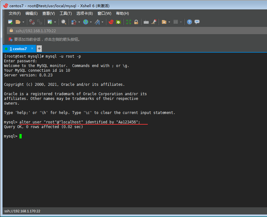 然后輸入alter user "root"@"localhost" identified by "Aa123456"; #修改密碼(Aa123456 為自己設(shè)的密碼可隨意變換)