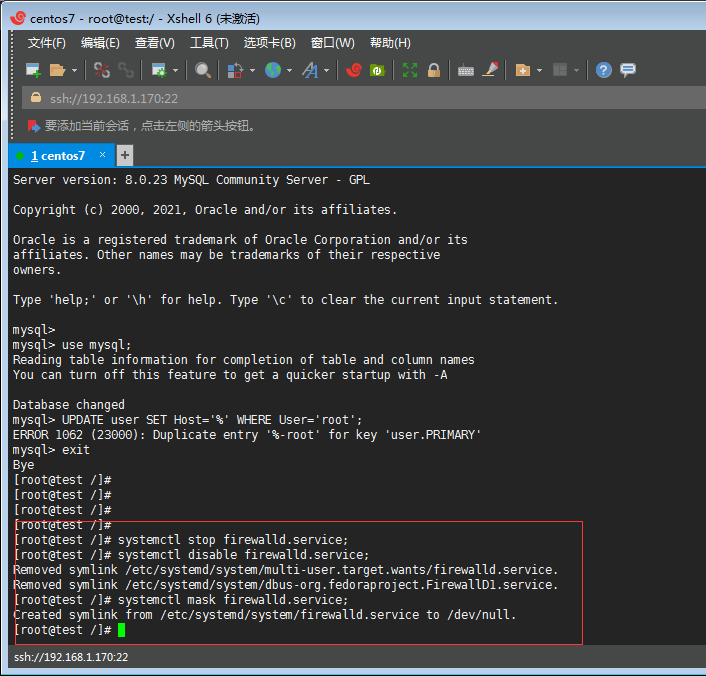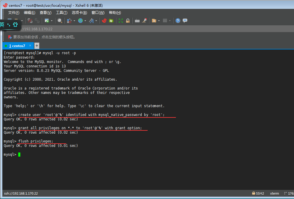 create user 'root'@'%' identified with mysql_native_password by 'Aa23456'; grant all privileges on *.* to 'root'@'%' with grant option; flush privileges; #立即生效
