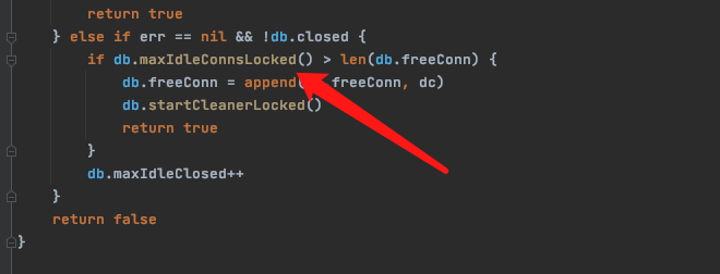 我們可以看到,當(dāng)最大空閑連接數(shù)小于客戶端與數(shù)據(jù)庫(kù)建立的連接數(shù)的時(shí)候,那么就會(huì)返回false,并且最大連接數(shù)關(guān)閉計(jì)數(shù)器加1。