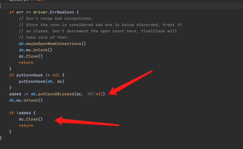 然后上圖中,我們就可以看到,連接被關(guān)閉了(MySQL源碼里也不留點(diǎn)緩沖時(shí)間再關(guān)閉)。Go的MySQL客戶端這個(gè)操作,就會(huì)導(dǎo)致當(dāng)突發(fā)流量情況下,由于請(qǐng)求量級(jí)過大,超過了最大空閑連接數(shù)的負(fù)載,那么新的連接在放入連接池的時(shí)候,會(huì)被無情的關(guān)閉,變成短連接,導(dǎo)致你的服務(wù)性能進(jìn)一步惡化。