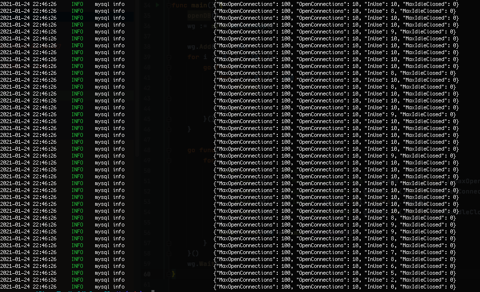 測(cè)試代碼 ,假設(shè)了以下場(chǎng)景,設(shè)置最大連接數(shù)為100,最大空閑連接數(shù)為20,并發(fā)數(shù)為10的goroutine來請(qǐng)求數(shù)據(jù)庫(kù),可以看到下圖中,無MaxIdleClosed的關(guān)閉統(tǒng)計(jì)。