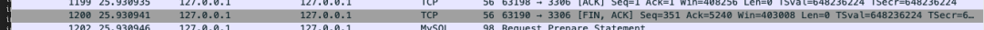 可以發(fā)現(xiàn)確實(shí)是tcp的狀態(tài)統(tǒng)計(jì)與MySQL客戶端的統(tǒng)計(jì)是一致的,并且存在fin包。