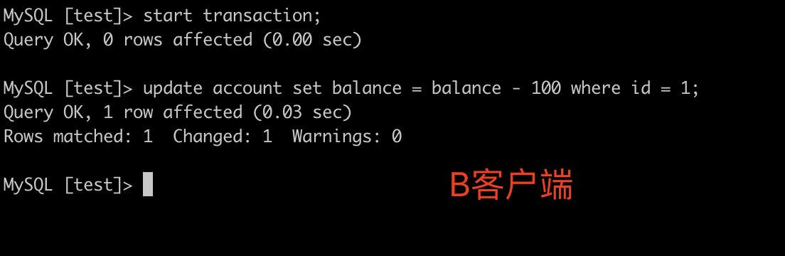 B客戶端開(kāi)啟事務(wù):start transaction;更新數(shù)據(jù):update account set balance = balance - 100 where id = 1;此時(shí)事務(wù)未提交