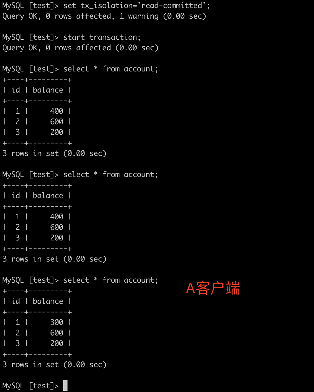 A客戶端再次查詢數(shù)據(jù):select * from account; 此時(shí)看到兩次查詢的數(shù)據(jù)已經(jīng)不一樣了