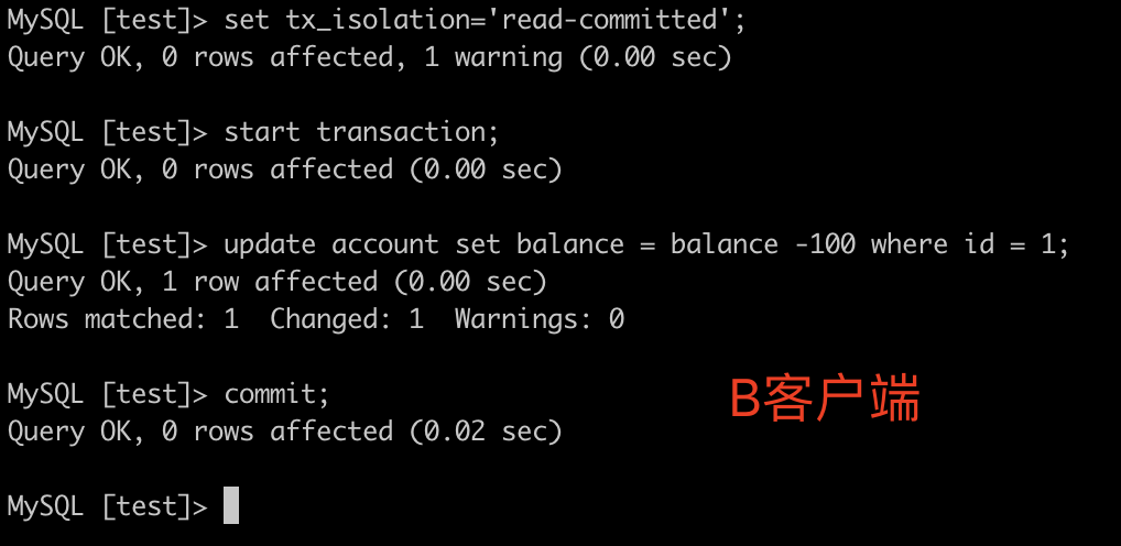 B客戶端開(kāi)啟事務(wù):start transaction;更新數(shù)據(jù):update account set balance = balance - 100 where id = 1; commit提交事務(wù)