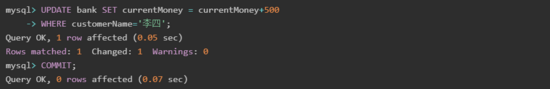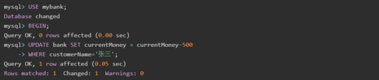 在 A 窗口中開啟一個事務(wù),并更新 mybank 數(shù)據(jù)庫中 bank 表的數(shù)據(jù),SQL 語句和運行結(jié)果如下: